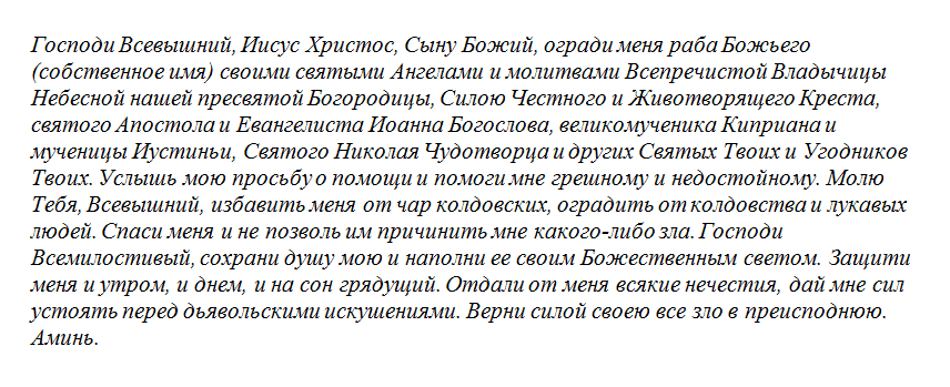 «Господи Иисусе Христе, Сыну Божий услышь мольбу раба Божьего (собственное имя) о помощи и защите от Дьявола. Ниспошли своих Ангелов светлых, чтобы оградили меня от коварных действий злой силы. Пусть молитвы Пресвятой Богородицы и всех Святых станут защитным кровом для меня. Пусть не сможет мне навредить колдовство и чародейство лукавых людей. Господи, прошу тебя, благодатных светом твоего сияния сохранить меня утром, днем, вечером и на сон грядущий. Силою благодати твоей, Господи, отврати всякие злые нечестия, ниспосланные Дьяволом. Кто из людей недобрых думал плохо и делал зло — верни им деяния обратно в преисподнюю. Благословенно Царствие Твое. Аминь».