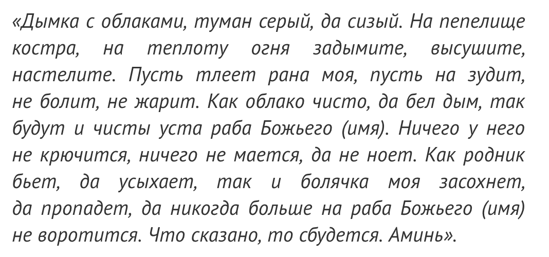 «Облачная дымка да серый туман. Пепел костра осушите, на жар костра подуйте. Как небо чистое, как облака белые, так пусть и раны раба Божьего (имя) развеются как дым. Как чистый родник живет, затем усыхает, так пусть раны истощаться и пропадут без следа. Что изречено, то сбудется. Аминь»