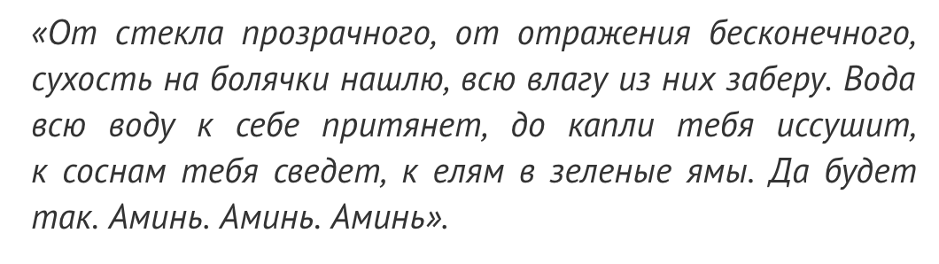 «Как вода к себе воду притягивает, так пусть и болячки мои осушит. Как отражение в зеркале вечное, так и раны пусть навечно уйдут. Пусть будет так. Аминь».
