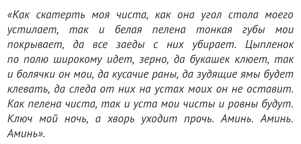 «Извожу тебя болезнь. Хворь на лоскут забираю из уст моих. Пока мне горячо хворь живет, как остынет лоскут – хворь умрет. Забираю хворь от уст своих красных, выкину на двор свиньям на съедение. Это мое хотение. Да будет так. Аминь». После того, как лоскут остынет, его надо вынести из дома и закопать. Кушать и пить не рекомендуется до вечера. Такой заговор от герпеса на губах заставит скорее сойти с лица нежелательные пузырьки.